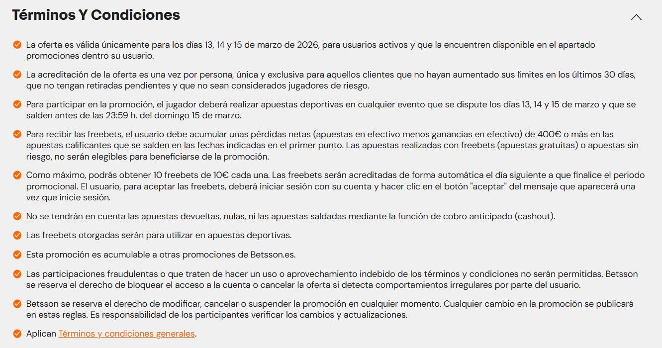 Apuestas válidas: sin importe mínimo, simples o combinadas, en vivo o prepartido, cualquier evento (de las competiciones válidas) y mercado, sin cuota mínima