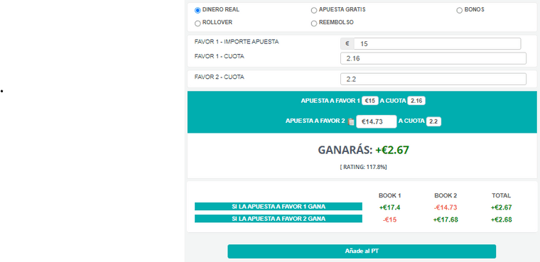 Entonces acá ya tienes el importe a apostar que es 15 y la cuota mejorada que es 2.16.