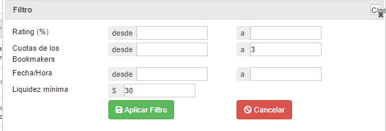 @jonafer219 las ganancias de la apuesta gratis las determinará el rating, por lo general aquellos eventos con una cuota más alta, tienen mejores rating, pero no es siempre así. Lo que si ocurre siempre, es que mientras más alta sea la cuota, más alto será el riesgo a cubrir. Entonces si quieres invertir menos en cubrir el riesgo, lo mejor es filtrar por un rango de cuotas, de modo que te aparezcan eventos cuyas cuotas requieran una inversión menor en riesgo.