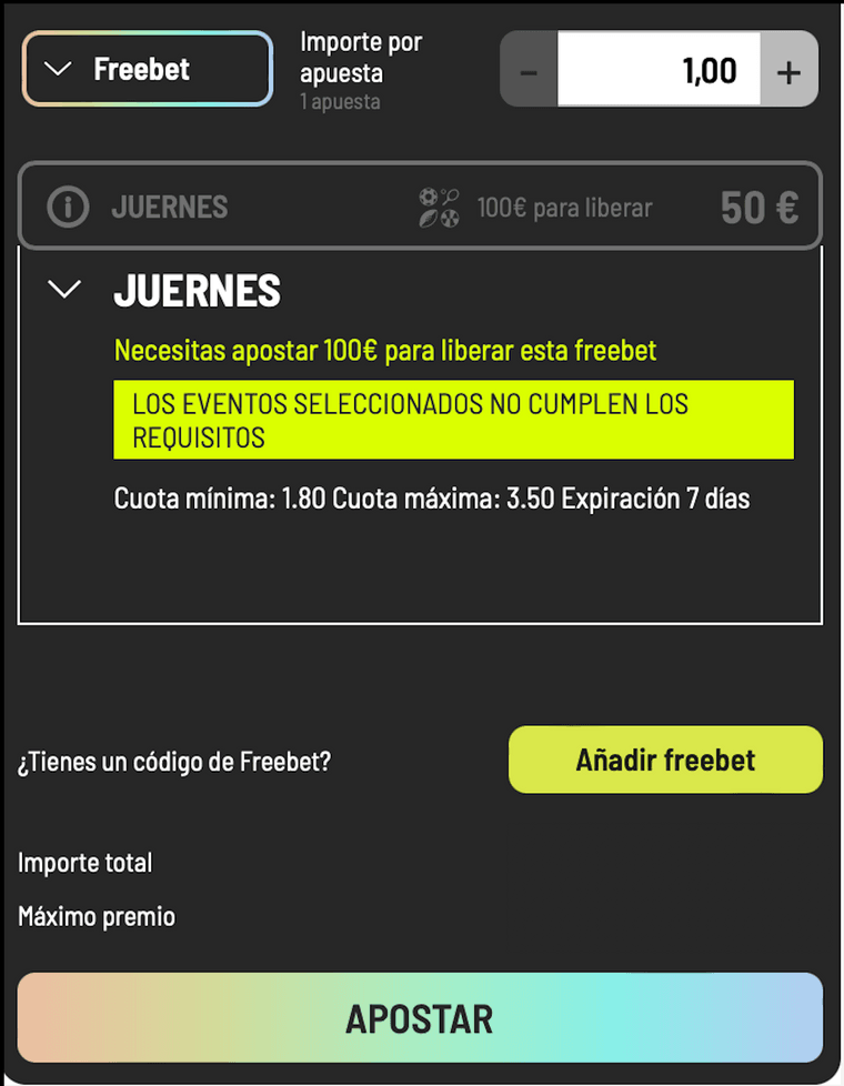 @bobsal Correcto, selecciona una apuesta al azar y apareció así. Dice que que hay que apostar 100€ y que la cuota mínima son 1.8 y la máxima 3.50.