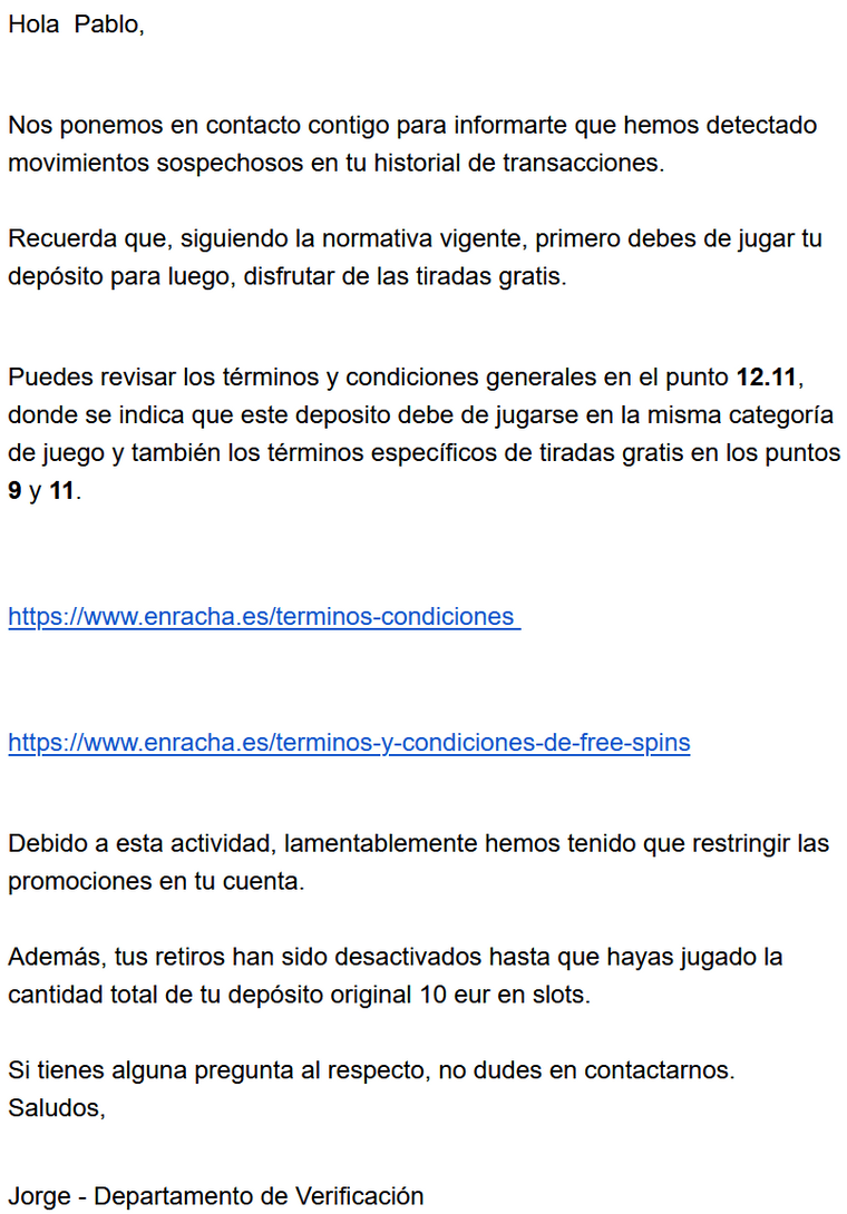 Buenas. Me han enviado un correo de que me bloquean los retiros y me han hecho jugar los 10€ depositados en slots (no dejan en apuestas) para poderlos retirar.