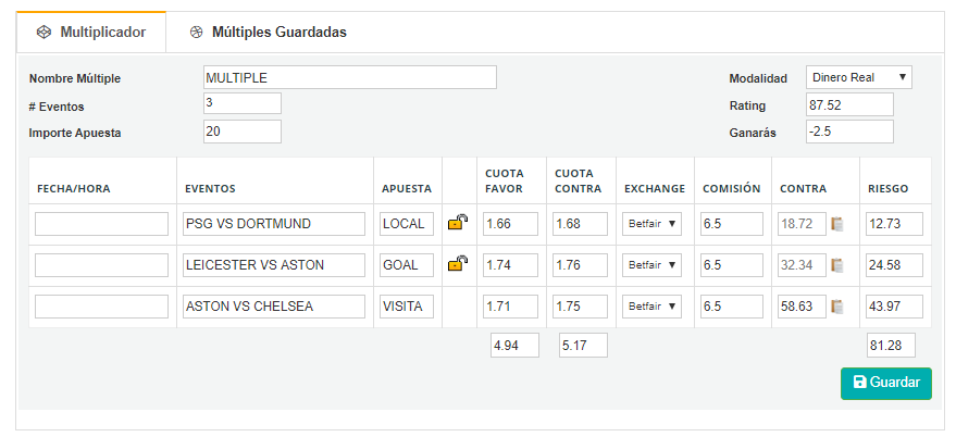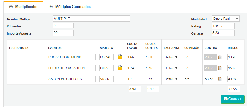 Buenos días Carlos, tengo una duda para casos posteriores y otros bonos, he buscado 3 partidos en distintos días, cuando pongo las cuotas, al inicio cierro el candado y sale el RIESGO REAL, pero luego cuando abro los candados sale un riesgo mayor, ¿Por qué pasa eso? Y por cierto tampoco entiendo, ¿Qué pasa si gano las 2 primeras en Betway, entonces estaría perdiendo dinero con esas 2 en Betfair? Eso no me cuadra, espero puedas ayudarme por favor, porque encontré 2 casas de apuestas donde dan una gratuita de $100 por realizar una combinada de 4 con cuota mayor a 1.5, y quisiera ampliar mis ganancias con esta modalidad, muchas gracias de antemano, estaré atento a tu respuesta.