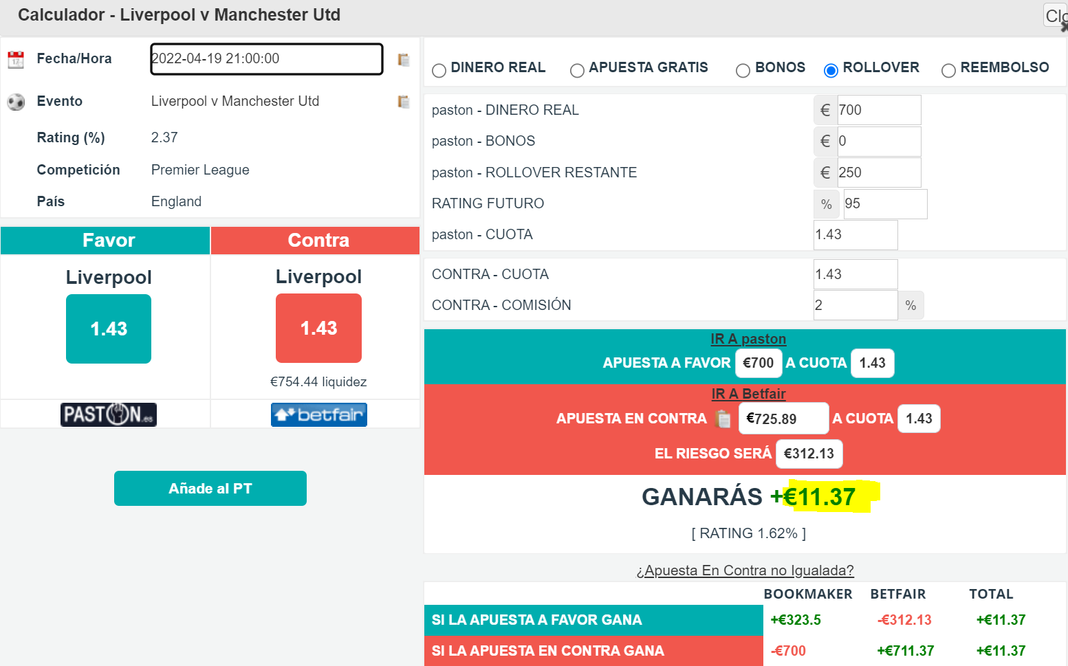 Hola @david hay algo que no me cuadra de la calculadora en modalidad rollover. Nunca lo he utilizado de esta forma ya que uso mi propio excel para llevar esa contabilidad de varias apuestas y he notado lo siguiente. Si cambio el rating futuro en los ajustes me salen diferentes resultados, es decir con el rating futuro mayor me salen resultados que no salen si lo reduzco. Voy a poner unos pantallazos para que quede más claro.