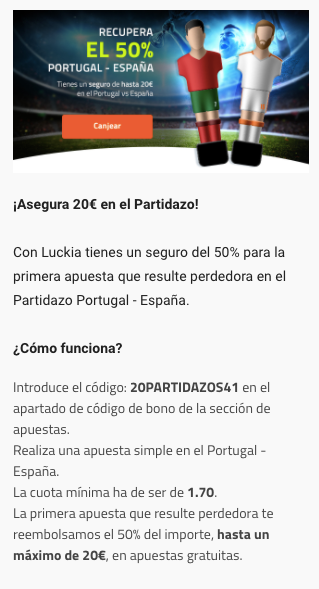 @CelticFrog Es raro que te la hayan dado. He localizado el mail y he consultado TyC, y efectivamente, esclarece lo de la cuota mínima por selección: Las apuestas combinadas deben ser igual o superior a 10 € y de un mínimo de 3 eventos. La freebet solo será válida durante los 7 días posteriores a su fecha de emisión y podrá usarse en apuesta simple (cuota mínima de 1.70) o apuesta combinada de un mínimo de 3 selecciones (cuota mínima de 1.70 por selección), en cualquier deporte y mercado de la sección Deportes, a excepción de la Champions League. En fin otra [censored], vaya mes llevo, vaya mes!!