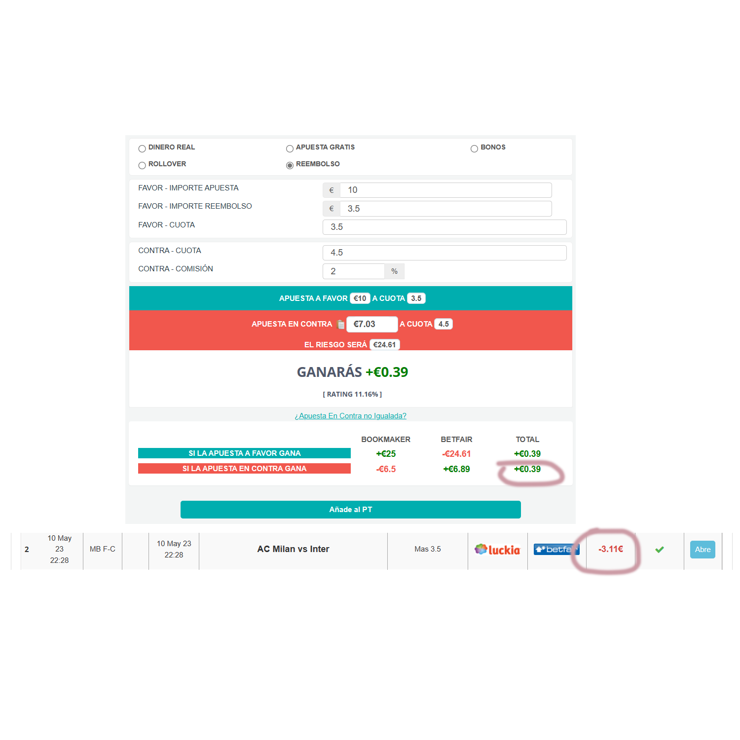 Que pierdas, y recibas el reembolso. En este caso quedas con una perdida temporal, que luego es compensada cuando agregas al PT la apuesta gratis. Es decir en ese caso tendrás 2 líneas para la misma oferta en el PT.
