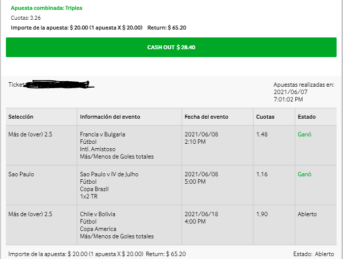 @Carlos Buen dia equipo, he cometido una equivocación con uno de los partidos de la combinada de la semana anterior, para optar al bono recurrente. Resulta que el ultimo partido que habia seleccionado era Chile vs Bolivia del 8/06 pero cuando hice el cupón en betway he escogido el mismo partido pero para el 18/06, es decir dentro de casi una semana. Que me recomiendan hago un cashout y hago otra combinada (no se si ese dinero del cashout me sirva) o espero que corra esa apuesta la semana entrante?