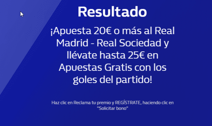 La apuesta que califica para esta promoción deberá ser de un valor de 20€ o más (no se tendrán en cuenta apuestas fraccionadas de menor tamaño). En el caso de que la 1ª apuesta realizada por el cliente al Real Madrid - Real Sociedad sea menor de 20€, no se le otorgará ninguna Apuesta Gratis.
