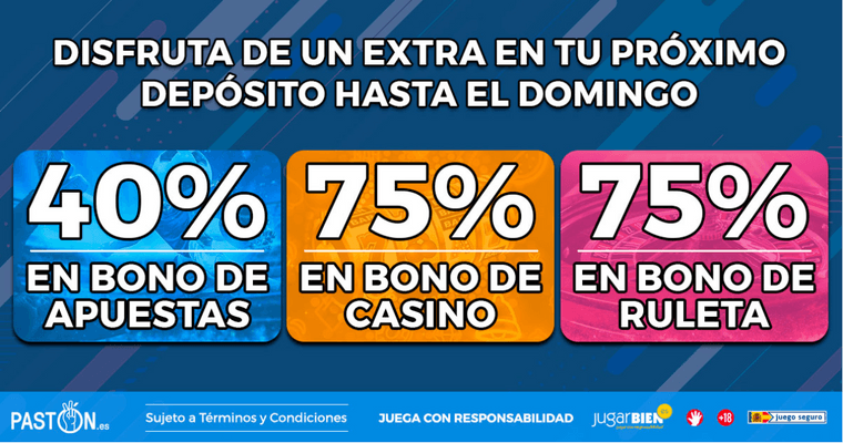 ¿Cómo puedo hacer uso de la promoción? El Bono de Casino solo es válido en la sección de Virtuales, Slots y Blackjack de PASTÓN.es. El Bono de Ruleta solo es válido en la sección de Ruletas de PASTÓN.es. El Bono de apuestas solo es válido en la sección de Apuestas de PASTÓN.es.