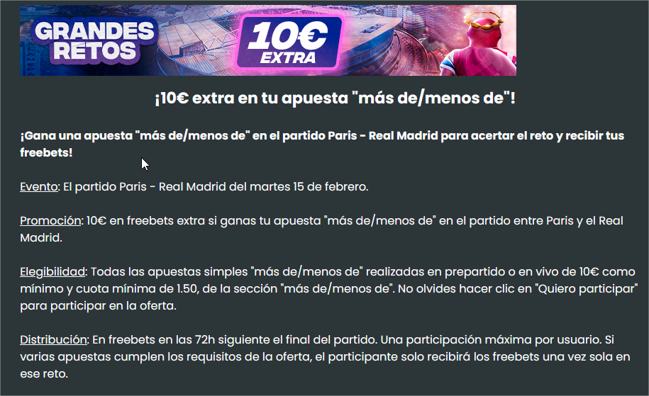 @lpmbet la verdad es que no queda claro, en los términos pone que puedes recibir de 50 hasta 150€ en freebet, pero no te explica cómo. A pesar de eso, siendo dos partidos, el Milán y el Dortmund con una diferencia de solo 30 minutos, no he conseguido encontrar la manera de aprovecharla